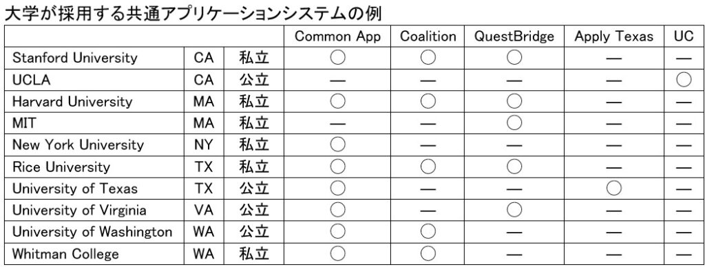複数のアプリケーション・システムを採用する大学も、少なくありません。どのシステムを選んでも結果に違いはありませんが、採用大学数が最も多いCommon Appを最初に選ぶのが、一般的です。Common Appでは、最大20校までアプライできます。もし、20校を超えてアプライしたい場合は、Coalitionなど他のアプリケーションシステムと組み合わせることになります。
